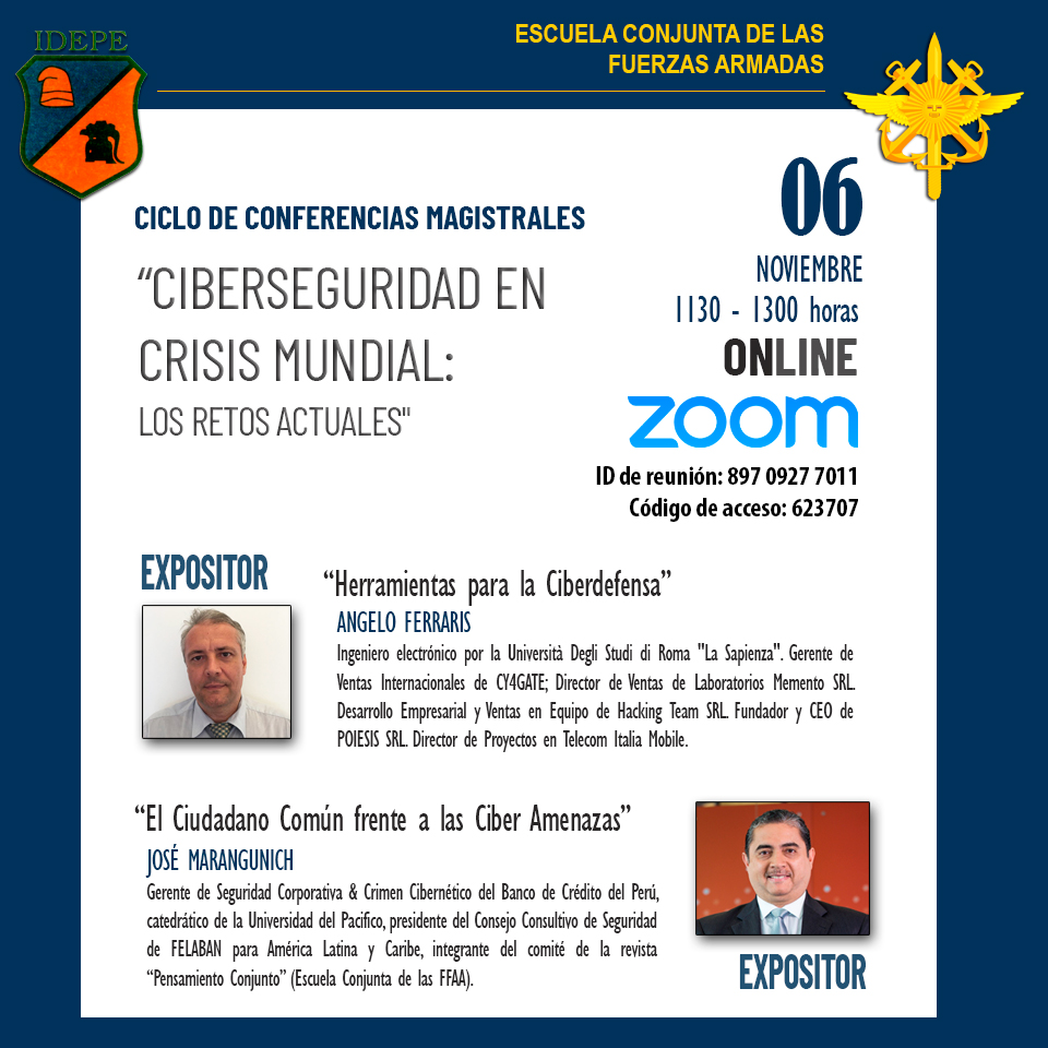 El viernes 6 de noviembre, la Escuela Conjunta de las Fuerzas Armadas y el Instituto de Estudios Políticos y Estratégicos organizan un nuevo ciclo de conferencias magistrales en la cual participarán el señor Angelo Ferraris como expositor en “Herramientas para la Ciberdefensa” y el señor José Marangunich como expositor del tema “El ciudadano común frente …
