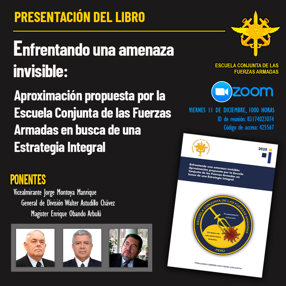 El Director General de la Escuela Conjunta de las Fuerzas Armadas Contralmirante Walter RABINES Cuttin, tiene el agrado de invitarlo a participar de la presentación del libro “Enfrentando una amenaza invisible: Aproximación propuesta por la Escuela Conjunta de las Fuerzas Armadas en busca de una Estrategia Integral”, la cual se llevará a cabo el viernes …