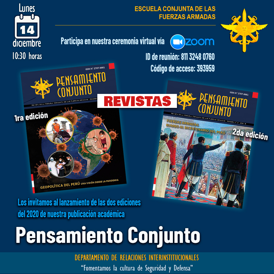 El presente año 2020, la Escuela Conjunta de las Fuerzas Armadas presenta las dos ediciones de su revista académica Pensamiento Conjunto. Por ello, el Director General de la Escuela Conjunta de las Fuerzas Armadas Contralmirante Walter RABINES Cuttin, tiene el agrado de cursar la invitación a participar de un foro virtual en el cual participarán …